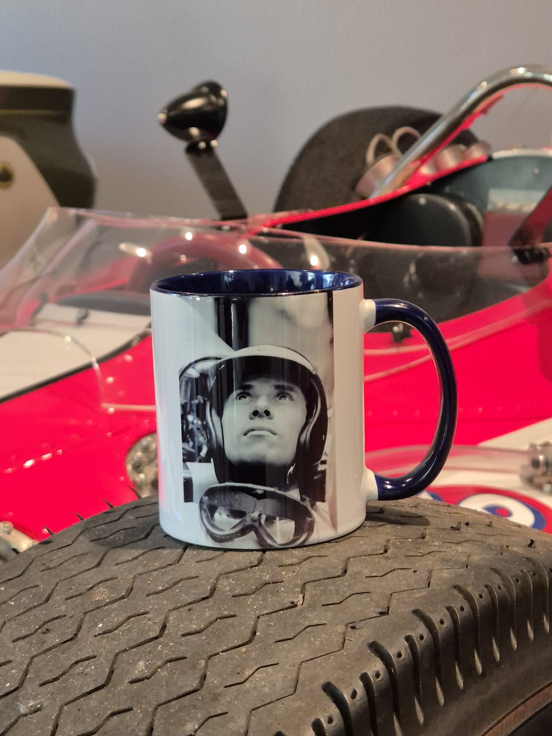 Crafted from durable ceramic, this 11oz mug features a navy blue interior and matching handle, blending classic style with everyday practicality. One side proudly displays an iconic image of Jim Clark, captured by Eric Bryce (used with permission from the Jim Clark Trust), while the reverse bears the official Jim Clark Trust logo — a perfect tribute to one of racing’s greatest champions.